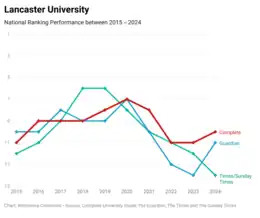 Lancaster has ranked in the top fifteen in all three UK national league tables for the past 10 years, and received a Gold rating in the Government's inaugural (2017) Teaching Excellence Framework.[5] The annual income of the institution for 2021/22 was £357.9 million of which £48.1 million was from research grants and contracts, with an expenditure of £402.9 million.[1]