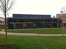 In the south-west corner sits the library designed in 1964 by Tom Mellor and Partners, the first phase opening in September 1966, the second in July 1968 and the third in January 1971.[20] The library was extended in 1997 and underwent a phased refurbishment in 2014, which was completed in 2016. In 2021 the Library Extension Project [21] was completed, which introduced additional student study space and 'living walls', exhibition and research space, a 'safepod'[22] and digital studio.
