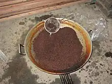 Latík in Luzon is made from coconut milk simmered in a saucepan until it reduces to coconut oil and solids ("coconut curds") begin to form at the top surface. These solids are left to fry in the coconut oil until golden brown.[8][9] In the Visayas, these solids are known as lunok in Cebuano; and balutai in Karay-a.[10]