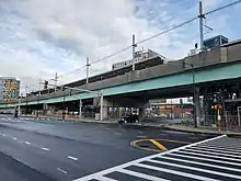 A groundbreaking ceremony for the main GLX construction phase was held on June 25, 2018.[140] Construction began in mid-2019.[2] Work at Lechmere station started by September 2019; the concrete pillars for the viaduct were poured later that year, while installation of the beams supporting the trackways and platform began in January 2020.[141][142][143] Installation of the beams through the station was completed in April 2020.[144]