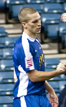 The sides met four times in the 2008–09 season, with both teams vying for promotion to the Championship. On 18 October 2008, Luciano Becchio gave Leeds the lead at the Den, but goals from Dave Martin and a brace from Neil Harris secured a 3–1 win for Millwall. Jermaine Beckford scored both goals in the return fixture in a 2–0 win for Leeds. Both teams finished in the League One play-offs; Leeds in fourth on 84 points and Millwall in fifth place with 82 points, which set up a two-legged semi-final. Millwall won the first leg at the Den 1–0, with a goal from Neil Harris in the 71st minute.[8][9] In the return leg at Elland Road, a record 37,036 fans saw the biggest game between the two sides.[38] Leeds evened the tie on aggregate at 1–1, with a goal by Luciano Becchio in the 53rd minute. A goal from Jimmy Abdou in the 74th minute won the semi-final for Millwall, sending them to Wembley.[38] The Lions went on to lose the 2009 League One play-off final 2–3 to Scunthorpe United. Both teams were again battling for promotion in the 2009–10 season. Due to trouble in previous seasons, a hugely unpopular 'anti-hooligan operation' was introduced by West Yorkshire Police in 2010 for Millwall fans to exchange vouchers for tickets at Woolley Edge service station on the M1 motorway near Wakefield.[15][17] The restriction severely affected the atmosphere in the ground; limiting the number of supporters attending away games at Elland Road, from the capacity of 3,000 visiting fans down to just 150.[16][39] The Whites were top of the table for most of the first half of the 2009–10 season, and only lost once in their first 24 games. That defeat was a 2–1 loss at the Den, with goals from Neil Harris and Gary Alexander. In March 2010, Millwall completed their second League double over Leeds, with Steve Morison and Shaun Batt securing a 2–0 win at Elland Road. It was their first away win in the fixture in 22 years.[40] At the end of the season Leeds finished second in League One on 86 points and were promoted automatically. Millwall finished third on 85 points and were promoted via the play-offs, with a 1–0 win over Swindon Town in the 2010 League One play-off final.[40]