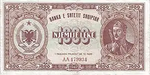 In 1926, the National Bank of Albania (Banka Kombëtare e Shqipnis) introduced notes in denominations of Fr.A. 1, Fr.A. 5, Fr.A. 20 and Fr.A. 100. In 1939, notes were issued in denominations of Fr.A. 5 and Fr.A. 20. These were followed in 1944 with notes for 2 Lek, 5 Lek, 10 Lek, and Fr.A. 100.