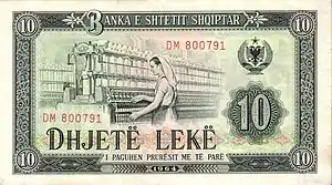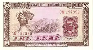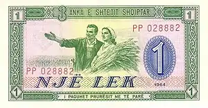 In 1965, notes (dated 1964) were introduced by the Banka e Shtetit Shqiptar in denominations of 1 Lek, 3 Lek, 5 Lek, 10 Lek, 25 Lek, 50 Lek and 100 Lek. A second series of notes was issued in 1976 when the country changed its name to the People's Socialist Republic.