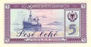 5 Lek | Purple | Steam train and truck | Ship |