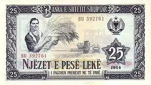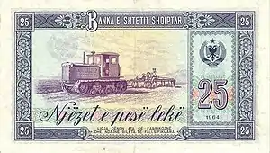 25 Lek | Dark blue | Woman with wheat, combine harvesting | Mechanized ploughing |