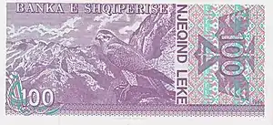 100 Lek | 154 × 72 mm | Violet | National fighter | Falcon and mountains |