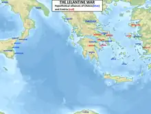 ![]() Hypothetical alliances of Chalcis (blue) and Eretria (red) during the Lelantine War.[1] | |||||||||