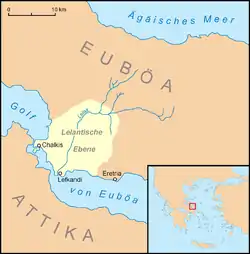 The Lelantine War was a military conflict between the two ancient Greek city states Chalcis and Eretria in Euboea which took place in the early Archaic period, between c. 710 and 650 BC.[2] The reason for war was, according to tradition, the struggle for the fertile Lelantine Plain on the island of Euboea. Due to the economic importance of the two participating poleis, the conflict spread considerably, with many further city states joining either side, resulting in much of Greece being at war. The historian Thucydides describes the Lelantine War as exceptional, the only war in Greece between the mythical Trojan War and the Persian Wars of the early 5th century BC in which allied cities rather than single ones were involved.[3]