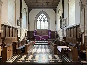 The priory church built for the regular canons, was constructed sometime between 1130 and 1146. The design is typical of Augustinian churches with a wide aisleless nave, central tower, and transepts.[13] The part of the church to the west of the tower served as the parochial church with the eastern portion for the private use of the canons. A division of the parochial and conventual parts were clearly demarcated by a solid rood screen in the western arch of the tower. Against this stood the high altar of the parish church. Several of the original Norman windows remain. The porch to the north doorway was a later addition in the 14th century. Coloured paintings dating from the 14th century were uncovered during restoration work to the church wall in about 1880.[1] The figures depicted included a kneeling angel, the virgin Mary, and flowing patterns of scrolls and flowers. These paintings deteriorated rapidly after being uncovered and have since been lost.