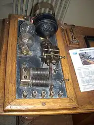 The Telekino has three different parts: a wireless telegraph receiver, a multi-position rotary switch and two servomotors that can be used to drive a mechanical system. The signal transmitted by electromagnetic waves, is received by the antenna and is transformed into electric pulses by a coherer. Each pulse drives an electromagnet, which closes its secondary circuit causing the multi-position switch unit to go one step forward. This operation is repeated automatically as many times as the number of signal impulses. When the multi-position switch reaches its final position, the battery supplies current to the chosen servomotor terminal. Then, the servomotor is put in motion causing a known and previously defined action. Torres realized that in order to achieve a finite but not limited set of actions based on a binary system as the telegraph was, (with only two states, on and off), it was necessary to create a limited number of codewords through a sequence of binary states. The problem, at that time, was the impossibility of having a synchronisation mechanism able to detect the end of one character and the beginning of the next. In this situation, the only way to solve this difficulty was using an asynchronous synchronisation method based on the change in the telegraph signal state. The final proposal was as simple as using a code based on the number of pulses consecutively sent; so, the action, e.g. number 1, corresponded to one pulse, to two pulses corresponded the action number 2, to three pulses the action number 3 and so on.[71] Torres was able to select different positions for the steering engine and different velocities for the propelling engine independently. He was also able to act over other mechanisms such a light, for switching it or not, and a flag, for raising or dropping it, at the same time. Specifically, Torres was able to do up to 19 different actions with his prototypes.[72]