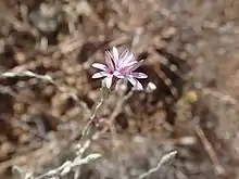 Lessingia hololeuca is an annual herb varying in maximum size and shape from flat and just a few centimeters high to an erect 40 centimeters tall. It is mostly woolly in texture. The lower leaves approach 13 centimeters long and may have several deep lobes; the upper leaves much smaller and unlobed. The flower heads appear singly or in crowded clusters. Each head has a bullet-shaped involucre lined with woolly, purple-tipped phyllaries. The head is discoid, containing no ray florets but many funnel-shaped pink, lavender, or purple disc florets with lobes that resemble ray florets. The fruit is an achene with a whitish pappus of bristles.