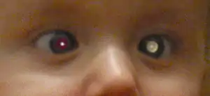 On photographs taken using a flash, instead of the familiar red-eye effect, leukocoria can cause a bright white reflection in an affected eye. Leukocoria may appear also in low indirect light, similar to eyeshine.