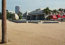 Levitated Mass is a 2012 large-scale public art sculpture by Michael Heizer at Resnick North Lawn at the Los Angeles County Museum of Art. The installation consists of a 340-ton boulder sculpture placed above a 456-foot viewing pathway to accommodate 360-degree viewing.[1] The nature, expense and scale of the installation attracted discussion within the public art world, and its notable 106-mile transit from the Jurupa Valley Quarry in Riverside County was widely covered by the media.[2][3]