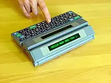 Lightwriters are a type of speech-generating device. The person who cannot speak types a message on the keyboard, and this message is displayed on two displays, one facing the user and a second outfacing display facing the communication partner or partners. A speech synthesiser is also used to provide speech output, and some models offer the facility to connect to a printer to provide printed output.