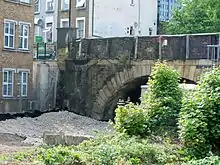 A stone and brick structure was built in its place, when Counter's Creek was converted into the Kensington Canal in 1826.[3] It opened for trade in 1828. Remnants of the bridge beneath the current road bridge are still visible from platform 4 on the Overground Line at the neighbouring station. The new bridge was subsequently named after Sir John Scott Lillie, the Peninsular War veteran and inventor and early 19th-century developer on the Fulham side, who was also involved with the canal project. Its railway associations go back to 1838 under the supervision of engineer, Robert Stephenson. The canal bridge was used to carry the road over the railway to the London and North Western Railway yard which had replaced the canal basin and wharves behind Reckitt Street, Fulham.[4]