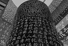 Lingua is composed of two 16' tall cylinders, with text cut with a water jet cutter in Russian, Mandarin Chinese, Ethiopian, French, Spanish, Latin, Greek, and Iroquois.[1] The texts are historical texts from as far back as 1400 BC.[2]