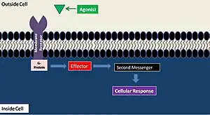 A general second messenger system mechanism can be broken down into four steps. First, the agonist activates a membrane-bound receptor. Second, the activated G-protein produces a primary effector. Third, the primary effect stimulates the second messenger synthesis. Fourth, the second messenger activates a certain cellular process.