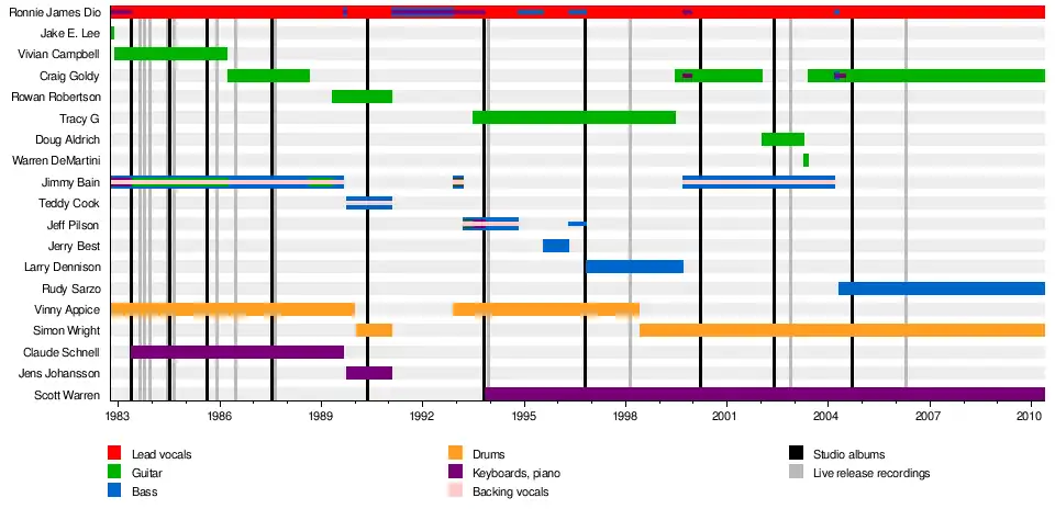 Dio was formed in October 1982 by vocalist Ronnie James Dio and drummer Vinny Appice following their departure from Black Sabbath.[1] For the first lineup, the pair worked with Rough Cutt guitarist Jake E. Lee and former Wild Horses bassist Jimmy Bain for around six weeks, before parting ways with Lee due to stylistic differences.[2] Preferring to work with British musicians, Dio asked Bain for suggestions of a replacement; he recommended Sweet Savage guitarist Vivian Campbell, and Campbell joined the group.[3] Around the release of the band's debut Holy Diver in May 1983, Claude Schnell joined as Dio's first full-time keyboardist.[4] After two more studio albums – The Last in Line and Sacred Heart – as well as live release Intermission, Campbell left the band in March 1986.[5] He was replaced by former Giuffria guitarist Craig Goldy.[6]