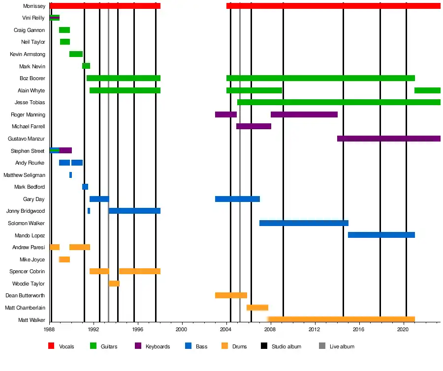 | Morrissey | 1988–present | lead vocals | All Morrissey releases |