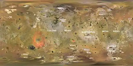This is a list of named regions on Jupiter's moon Io. These names have been approved for use by the International Astronomical Union. The features listed below represent a subset of the total known bright regions on Io's surface with many currently not having an officially approved name. These areas are large-scale regions on Io's surface that are notable for their difference in brightness or color from their surroundings. In most cases, these areas are bright terrains, consisting of sulfur dioxide frost/ice fields, suggesting that they are colder than their surroundings.[1]