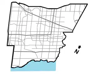 When Mississauga was incorporated as a city, land was transferred from Halton to Peel. At that time, Ninth Line marked much of the western boundary between Mississauga and Halton Region.[5] Due to an additional annexation west to Highway 407 in 2010,[6] the central section is now entirely within the city, but the road was never redesignated to reflect this. However, the stretch between Dundas St. and the vicinity of the Highways 403 and 407 interchange still serves as the west city limits, and Ninth Line also continues entirely within Halton north and south of these points.