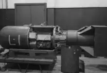 The Little Boy was 120 inches (300 cm) in length, 28 inches (71 cm) in diameter and weighed approximately 9,700 pounds (4,400 kg).[23] The design used the gun method to explosively force a hollow sub-critical mass of enriched uranium and a solid target cylinder together into a super-critical mass, initiating a nuclear chain reaction.[24] This was accomplished by shooting one piece of the uranium onto the other by means of four cylindrical silk bags of cordite powder. This was a widely used smokeless propellant consisting of a mixture of 65 percent nitrocellulose, 30 percent nitroglycerine, 3 percent petroleum jelly, and 2 percent carbamite that was extruded into tubular granules. This gave it a high surface area and a rapid burning area, and could attain pressures of up to 40,000 pounds per square inch (280,000 kPa). Cordite for the wartime Little Boy was sourced from Canada; propellant for post-war Little Boys was obtained from the Picatinny Arsenal.[25] The bomb contained 64 kilograms (141 lb) of enriched uranium. Most was enriched to 89% but some was only 50% uranium-235, for an average enrichment of 80%.[24] Less than a kilogram of uranium underwent nuclear fission, and of this mass only 0.7 grams (0.025 oz) was transformed into several forms of energy, mostly kinetic energy, but also heat and radiation.[26]