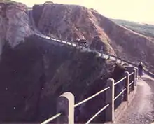 Until the beginning of the twentieth century, access to Little Sark was extremely difficult or, at best, unnerving. La Coupée was traversed by a narrow dirt track, and children are reputed to have had to crawl across it on their hands and knees to prevent being blown over the edge by the wind.[5] According to a description in 1875, "People have thrown themselves flat on their face, from terror and nervousness on reaching the Coupée; others have lost courage half way across, and have hidden themselves behind the heads of the rocks that crop up in the middle of the Coupée until some passer by came and led them along; others have been unable to get across without shutting their eyes and being led between two persons." On 4 September 1802, Elie Guille of the Clos-à-Jaon was carrying sheaves of corn across La Coupée for the payment of tithes. He was blown over the East side and killed. After that the Seigneurs farmed out the collection of tithes in Little Sark to an individual in Little Sark who could settle the dues in cash. There were for a long time arguments between the inhabitants and the Seigneur over whose responsibility it was to maintain the path across La Coupée. In 1811 a landslip reduced the width of the path to no more than 3 feet. Finally in 1812 an act of agreement was signed between the parties to ensure every male inhabitant subject to the ordinary repairs of the road would give two days' corvée to the La Coupée road and in return the Seigneur would guarantee to provide all remaining expenses. Following another landslip in 1862 on the Little Sark side a retaining wall was constructed so as to provide a foundation for a roadway 8–10 feet wide. However the narrowness of the path and the vertiginous drop were not the only things that made many wary of crossing La Coupée, especially at night, as the locality was reputed to be haunted. Strange moaning sounds or unearthly shrieks have been reported; however, these have been explained away as being due to the actions of wave and tide in La Caverne des Lamentes in the bay.[6] The black dog called the Tchico was also reputed to haunt La Coupée as it ran the roads of Sark. Sibyl Hathaway, Dame of Sark, recorded that some of the Islanders believed that the reason why her donkey would not cross La Coupée was because of sensitivity to the presence of the Tchico.[7]