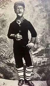By 1878 Little Tich's parents were unable to financially provide for him further and he sought full-time employment as a lather boy in a barber's shop in Gravesend.[8][9] One evening, together with a friend whose brother was appearing in a talent contest, he visited a music hall for the first time and quickly became "hooked"[10] on the idea of being able to perform. Thanks largely to his local celebrity status of being a "freak",[11] he was welcomed into the many public houses which catered for soldiers, sailors, merchant seamen and day-trippers from London.[12]