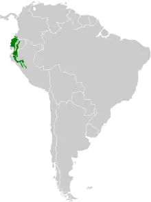 The little woodstar is found from extreme southwestern Colombia through western Ecuador into northern Peru and discontinuously in eastern Ecuador and north central Peru. It inhabits the transition zone between semi-humid and humid deciduous forest. In elevation it ranges from sea level to 2,300 m (7,500 ft) in western Ecuador and between 900 and 3,000 m (3,000 and 9,800 ft) in eastern Ecuador and Peru.[6]