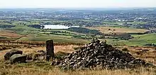 Within the boundaries of the historic county of Lancashire, Littleborough and its surroundings have provided evidence of Neolithic, Celtic, Roman and Anglo-Saxon activity in the area.[4] During the Middle Ages, Littleborough was a hamlet in the manor of Hundersfield, parish of Rochdale and part of the Salford Hundred.[1][6][7] It was focussed upon the junction of two ancient routes over the Pennines — one of which may have been a Roman road[4] — that joined to cross the River Roch. By 1472, Littleborough consisted of a chapel, a cluster of cottages, and an inn, and its inhabitants were broadly farmers who were spurred to weave wool by merchants who passed between the markets at Rochdale and Halifax.[1] When cotton was introduced as a base to make textiles, Littleborough experienced an influx of families, mostly from the neighbouring West Riding of Yorkshire.[1][7] Affluent homes and estates were established on Littleborough's fringes.[3]