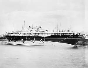 The Livadia was an imperial yacht of the House of Romanov built in 1879–1880 to replace a yacht of the same name that had sunk off the coast of Crimea in 1878. The new Livadia, intended for service on the Black Sea, was a radically novel ship conceived by Vice Admiral Andrey Popov, designed by naval architect Erast Gulyaev and built by John Elder & Co. of Govan on the Clyde. The Livadia continued Popov's line of circular ships although this time Popov sacrificed geometrical perfection for seagoing capabilities. She had a beam of 153 ft (47 m) against overall length of only 259 ft (79 m).[4] An extreme example of tumblehome architecture, she sported a conventionally shaped superstructure mounted on a wide, flat-bottomed, turbot-shaped submerged hull or pontoon.