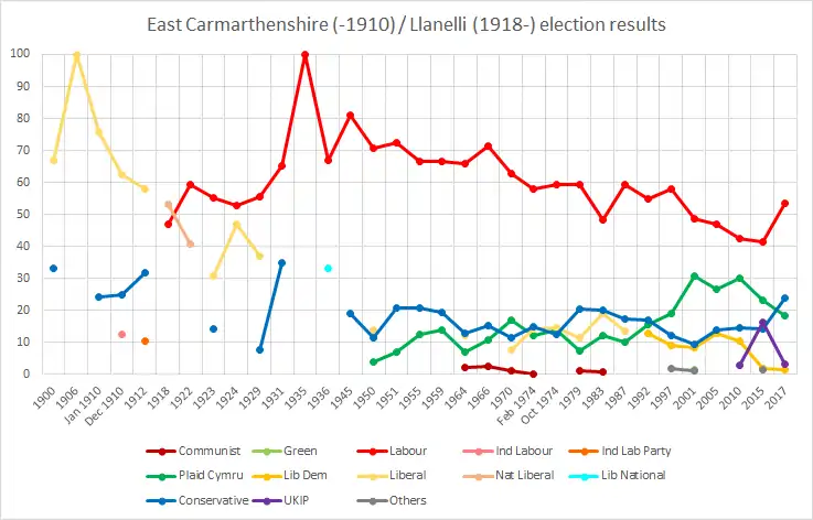 Llanelli has traditionally been an ultra-safe Labour seat, with a Labour MP representing the constituency since 1922. It was represented by one-time deputy leader of the Labour Party, Jim Griffiths, from 1936 until his retirement in 1970. In recent years however Labour's majority had been somewhat eroded by Plaid Cymru, who as of 2021 have won the equivalent seat in the Senedd in two of the six Senedd elections to date. At the 2015 general election, however, the Labour majority increased once again.