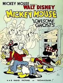 Lonesome Ghosts is a 1937 Disney animated cartoon, released through RKO Radio Pictures on Christmas Eve of 1937, three days after Snow White and the Seven Dwarfs (1937). It was directed by Burt Gillett and animated by Izzy (Isadore) Klein, Ed Love, Milt Kahl, Marvin Woodward, Bob Wickersham, Clyde Geronimi, Dick Huemer, Dick Williams, Art Babbitt, and Rex Cox.[2] The short features Mickey Mouse, Donald Duck & Goofy as members of The Ajax Ghost Exterminators. It was the 98th short in the Mickey Mouse film series to be released, and the ninth for that year.[3]