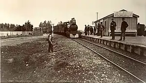 £1,336 was allocated for a new joint NZR/WMR station, with verandah,[16] built on the Awapuni side of the junction,[22] which opened on 23 October 1905.[23] By then WMR trains were running through to Palmerston and beyond.[24] To cater for the change, the Junction Hotel was rebuilt in 1906.[25] By 1911 the station had a loading bank, cattle and sheep yards, crane and a loop for 60 wagons, extended to 83 wagons in 1942. In 1923 electric lighting was added.[16]