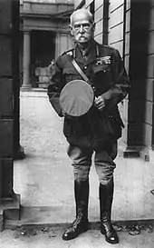 Lord Roberts became the last Commander-in-Chief of the Forces on 3 January 1901.[58] During his time in office he introduced the Short Magazine Lee Enfield Rifle and the 18-pounder Gun and provided improved education and training for soldiers.[59] In September 1902, Lord Roberts and St John Brodrick, Secretary of State for War, visited Germany to attend the German army manoeuvres as guest of the Emperor Wilhelm.[60] He served as Commander-in-Chief for three years before the post was abolished as recommended by Lord Esher in the Esher Report in February 1904.[3]