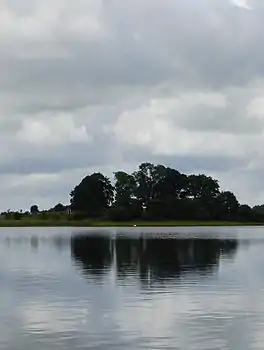 Lough Kinale measures about 2 km (1.2 mi) long and 1 km (0.6 mi) wide. The majority of the lake is in County Longford. The lake lies about 10 km (6 mi) east of Granard.[2] It is situated downstream from Lough Sheelin in the upper part of the catchment area of the River Inny, a main tributary of the River Shannon. A smaller lake, Lough Derragh, is linked to the outflow of the Inny River and Lough Kinale. It is a very shallow lake, with a maximum depth of around 4 m (13 ft). There are two parts, almost separated by a central swampy area. The margins of the lake have several reed beds, interspersed with calcium-rich marsh dominated by small sedges. The surrounding land has boggy areas, some of which have been converted to coniferous plantations. The water quality is variable, sometimes suffering from run-off of nutrients from agricultural land. At one time the lake was a trout fishery.[2][4]