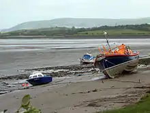 The Loughor Estuary (aka Burry inlet or Burry estuary, from the small Burry River which enters on the Gower side near its mouth) is the region of the waterway below the road and rail bridges at Loughor, where it turns abruptly from a southerly to a westerly direction towards Carmarthen Bay. The Afon Lliw empties into the estuary just below the Loughor bridges. This region almost completely empties at low tide, exposing extensive sandy areas supporting a thriving cockle industry.
