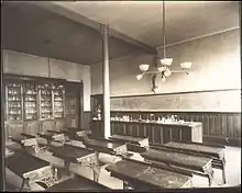 Loyola shares with the Notre Dame of Maryland University (formerly College of Notre Dame of Maryland) the Loyola Notre Dame Library, located between the two schools, and features a 100,000-square-foot (9,300 m2) interior; interactive study and instructional spaces; an exhibition area and curatorial space for special collections; expanded stack areas for humanities print collection; a café fully wired for voice, data, and video; five high-tech seminar rooms; digital studio for collaborative student and faculty projects; a media center with 96-seat auditorium; and a 24-seat, fully wired bibliographic classroom.[25]