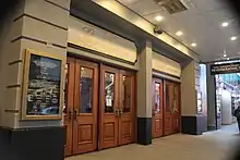 The first story contains a granite water table, blocks of rusticated stone, and doorways in each bay. The recessed doorways are originally designed as archways, which are partially concealed by the marquee.[7][13] The westernmost door is the stage door.[13][12] The easternmost two sets of doors lead into the ticket lobby, and the other doors contain auxiliary exits from the auditorium. Each of the lobby and auditorium doors contain paneled-wood doors with bronze handles, and the openings are also flanked by display boxes. The marquee above the doorways was added after the theater opened; it contains a band with foliate decorations, above which acanthus leaves rise vertically. The first story is topped by a frieze containing foliate decorations and flowers. Above the five central doorways are archivolts with sculpted heads, as well as modillion blocks with alternating somber and snarling faces.[13] The arches and faces served to identify the building's theatrical use.[17]