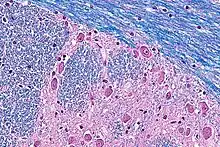 Luxol fast blue stain, abbreviated LFB stain or simply LFB, is a commonly used stain to observe myelin under light microscopy, created by Heinrich Klüver and Elizabeth Barrera in 1953.[1] LFB is commonly used to detect demyelination in the central nervous system (CNS), but cannot discern myelination in the peripheral nervous system.[2]