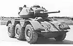 The Wolfhound had a crew of four and was armed with a 37 mm gun in a rotating open-topped turret, with an ammunition load of 93 rounds. Its secondary armament consisted of two machine guns; one mounted co-axially with the main weapon, the other on an AA pintle mounting. It was powered by a Cadillac, eight-cylinder, water-cooled engine. Each side featured three large tires on symmetrically placed axles, with distinctive curved mudguards. The frontal glacis plate was sharply sloped to improve protection. A radio antenna was mounted on the front right of the glacis.