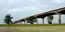 The section between Ferrybridge and North Cave was the last to be planned[5] and built.[13] The Ouse Bridge, across the River Ouse west of Goole, commenced in January 1973 and is nearly 1 mile (1.6 km) long and rises to 98.4 feet (30.0 m) above ground level. Completion of the bridge was delayed due to "steel supplies [being] a chronic headache" and a partial collapse of the framework caused by bolts joining a cross-beam to a trestle shearing.[5] Problems with the bridge delayed the opening of the section east of Goole to May 1976.[5][13]