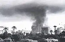 At the time of the fire, about 5,000 people were in the MGM Grand, a casino and 26-story hotel with more than 2,000 hotel rooms that had opened in 1973.[4][5] At approximately 7:07 a.m. on Friday, November 21, 1980, a fire began in a restaurant known as The Deli. The fire was discovered during an inspection of the restaurant by a tile crew. A crew supervisor noticed a flickering light, which turned out to be a wall of flames.[6][7] An employee of the hotel's bakery recounted how just after 7 a.m. he saw smoke coming from the ceiling vents just before the lights went out.[8] MGM security was immediately advised of the situation, and alerted the Clark County Fire Department (CCFD) which was the first agency to respond. CCFD received a call reporting the fire at 7:17 a.m., with the first engine arriving on site from across the street at 7:19 a.m.[7][9] A third alarm was called at 7:22 am, and a Metro Police helicopter pilot requested all available helicopters at 7:30 a.m.[9]