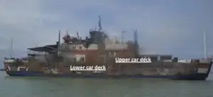 The fire destroyed both car decks. The condition of the vehicles on the lower deck was much more severe than those on the upper deck. Several were crushed as the upper deck collapsed due to the intense heat of the fire. Several structures on the ferry had been deformed by the fire. While the third deck and the bridge suffered significant destruction, several parts of the third deck only suffered slight damage. These areas were used by survivors as evacuation points. The wind at the time was blowing to the stern, preventing the fire from spreading to the bow and providing time for passengers to evacuate the ferry.[1]