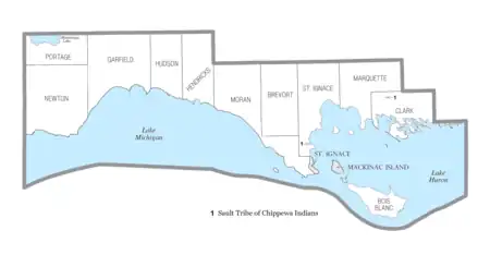 - The Sault Tribe of Chippewa Indians, which is headquartered in Sault Ste. Marie in Chippewa County to the north, occupies two small territories within Mackinac County. One is located in St. Ignace Township about 3 miles (4.8 km) north of the city of St. Ignace on the shores of Lake Huron. The other portion is located in rural northwest Clark Township.[9]
