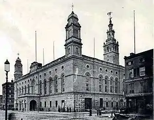 Topping the Garden's tower was a statue of Diana, by noted sculptor Augustus Saint-Gaudens, which caused Madison Square Park to become known as "Diana's little wooded park". The original gilt copper statue was 18 ft (5.5 m) tall, and weighed 1,800 lb (820 kg), and spun with the wind; Saint-Gaudens had draped the statue in cloth, but this was soon blown away.[2] The statue was put in place in 1891, but was soon thought to be too large by Saint-Gaudens and White. It was removed and placed on top of a building at The World's Columbian Exposition in Chicago, but the bottom half was destroyed by a fire after the close of the Exposition, and the top half was lost. In 1893, a hollow second version of the statue, 13 ft (4.0 m) tall and made of gilded copper, replaced the original. This is now at the Philadelphia Museum of Art, and a copy is in the Metropolitan Museum of Art.[2][4] Saint-Gaudens made several smaller variants in bronze, one of which was on display in the entryway of both Madison Square Garden III, built in 1925, and the current Madison Square Garden.
