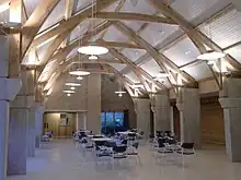 Officially opened on 2 July 2022, the New Library is the first library building constructed by Magdalene for 330 years and is situated in the western corner of the Fellows' Garden.[70] Designed by Níall McLaughlin Architects, it won the RIBA Stirling Prize in 2022 for its architectural achievements,[71] the first Oxbridge building to receive this accolade. It holds the College's books for undergraduate and postgraduate use, and it provides over 90 study spaces across three floors with views of the Fellows' Garden and the River Cam. There is also a group study room, social space, and an archive. The Robert Cripps Gallery provides gallery space for visiting exhibitions and for displaying parts of the College art collection to the wider community.