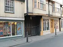 Situated on the north-east side of Magdalene Street is the porters' lodge, where mail to members of the college is delivered and distributed. Past the gatehouse by which the porters' lodge is situated lies First Court.[50] The First Court was the earliest court to be built. From 1760 the Court was faced with stucco, but most of the buildings were restored in a project between 1953 and 1966.[51] The chapel was the first to be built in around 1470, while the gatehouse including the porters' lodge and the street-front of the college did not exist until 1585.[48]