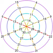 In the example in the figure, the following 4 × 4 most-perfect magic square was copied into the upper part of the magic circle. Each number, with 16 added, was placed at the intersection symmetric about the centre of the circles. This results in a magic circle containing numbers 1 to 32, with each circle and diameter totalling 132.[1]