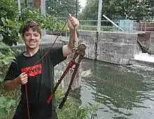 Magnet fishing is typically done with gloves,[9] a strong neodymium magnet secured to a durable rope between 15 and 30 meters (50–100 ft), and sometimes a grappling hook as a supplement to the magnet.[10]